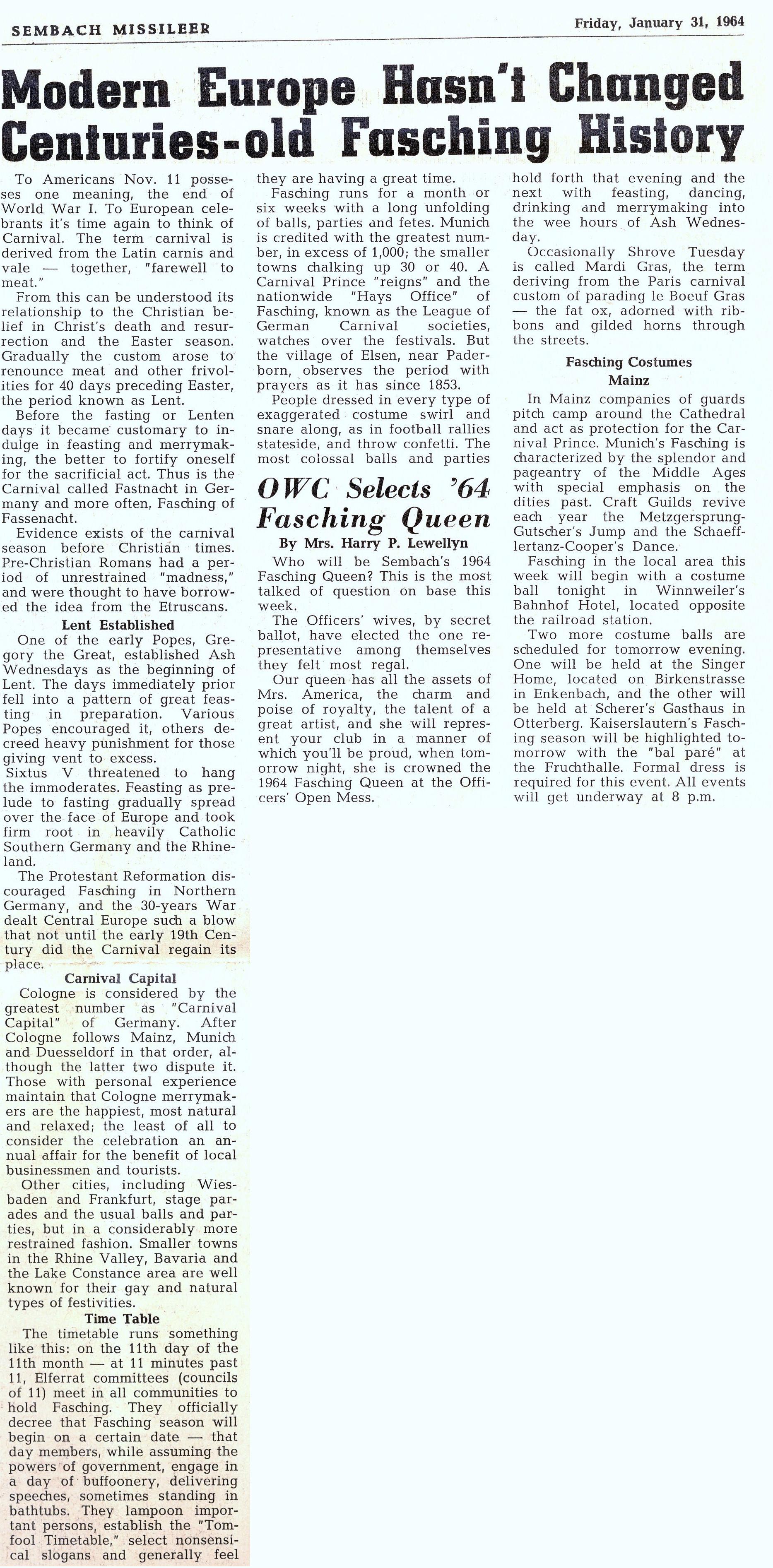 Modern Europe Hasn’t Changed Centuries-old Fasching History October 16, 2008 October 16, 2008 Sembach Missileer – 31 January 1964 (Courtesy of Hank Baltzersen – 38th MMS) Click on thumbnail to see larger image. Related